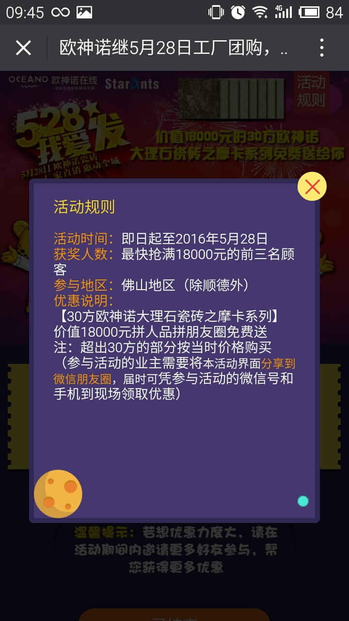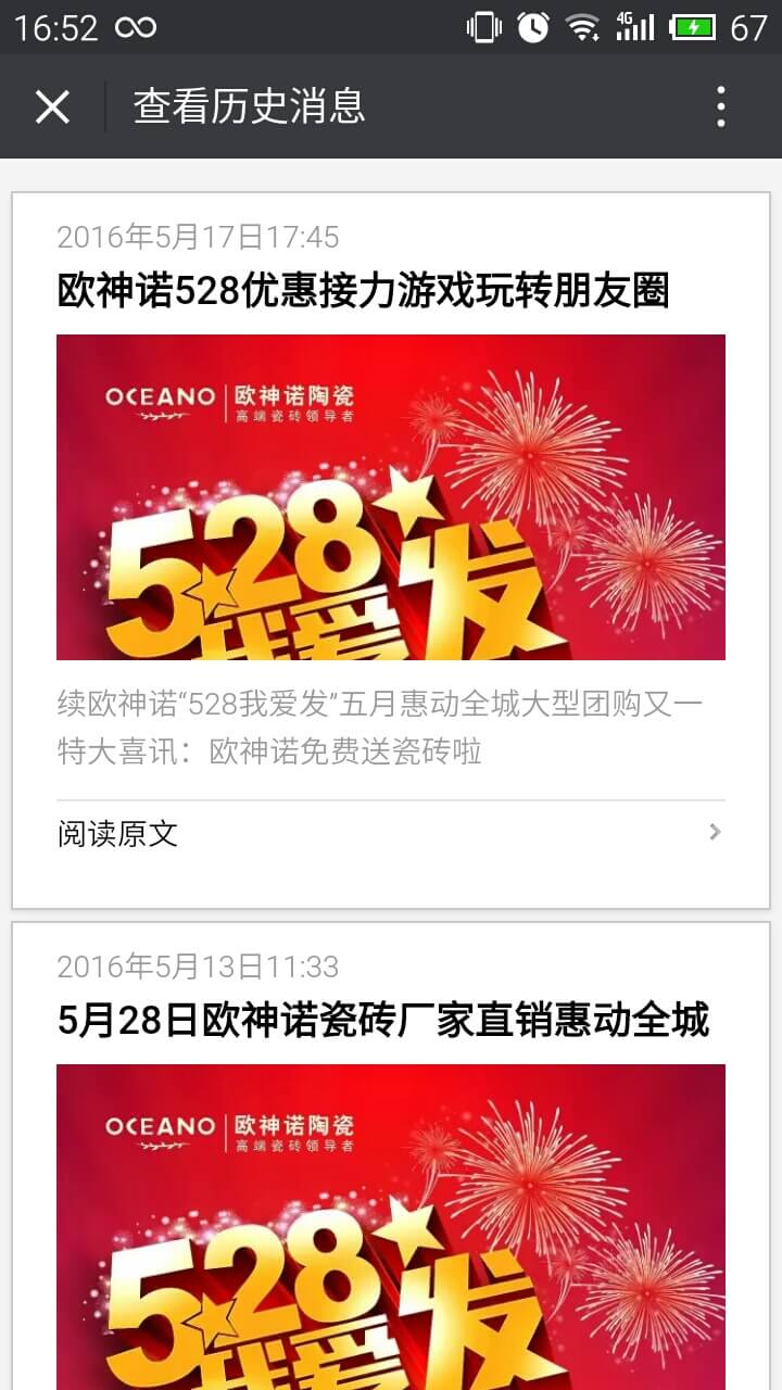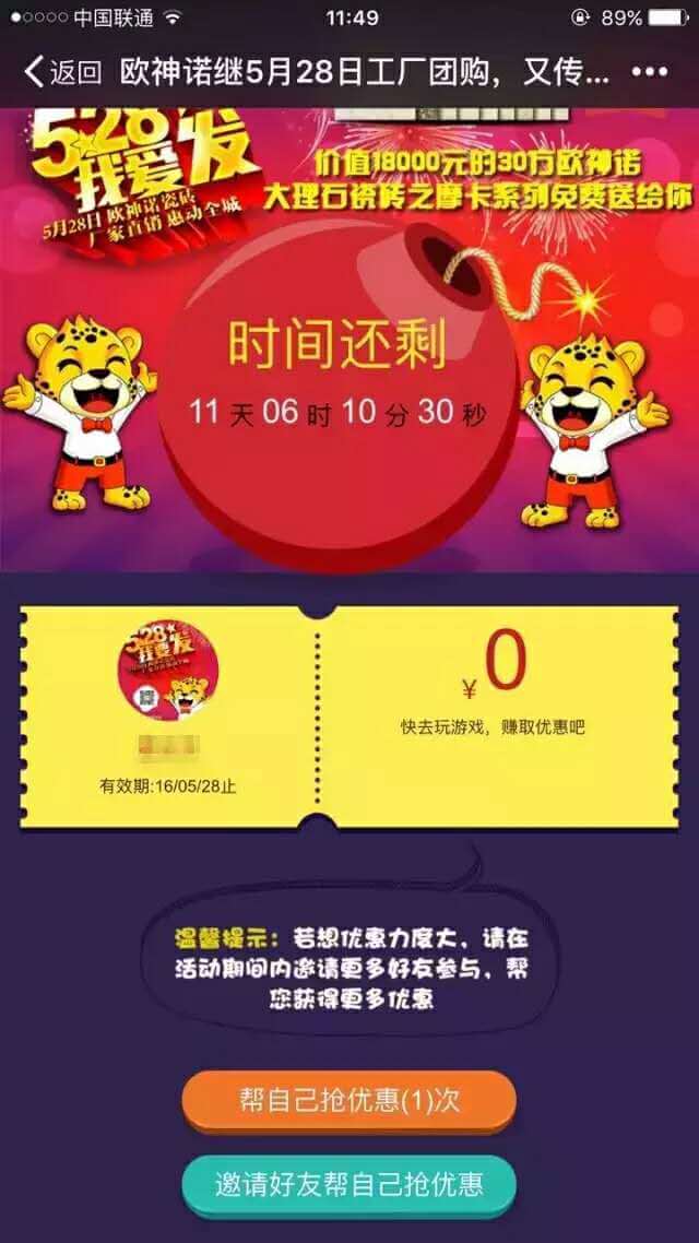 简介:欧神诺推出“528我要发”优惠接力游戏,关注公众号后即可参与抢优惠活动。规定时间里,刷的次数越多,优惠力度越大。同时,可以分享活动给好友帮自己抢优惠,最高可免费抢得30方欧神诺大理石瓷砖。给力的优惠力度,有趣的助力游戏,为公众号精准吸粉的同时达到良好的产品宣传效果。
